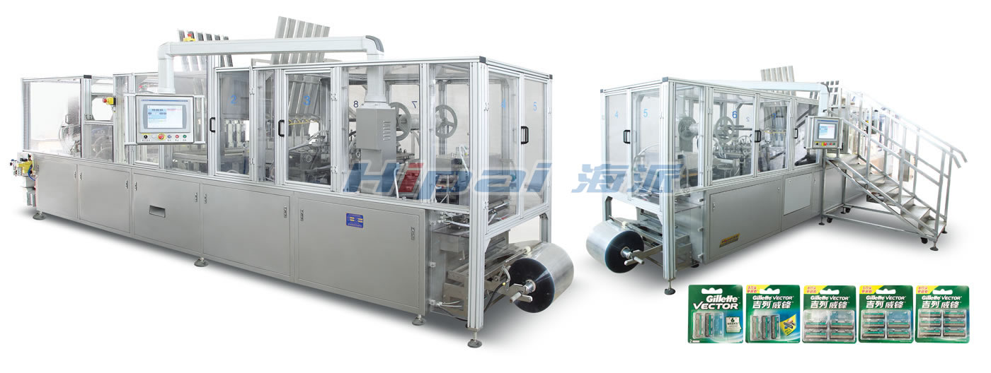 ■ 采用凹凸模/正/负压一体成型、打飞机孔(选配)、伺服电机牵引、冲裁、机械手过渡、自动加料(选配)、自动下纸卡、热封(上加热、下加热、高周波三选一)、自动在线喷码(选配)、成品机械手抓取(选配)、成品输送等组成包装一体机,结构简单,操作方便;